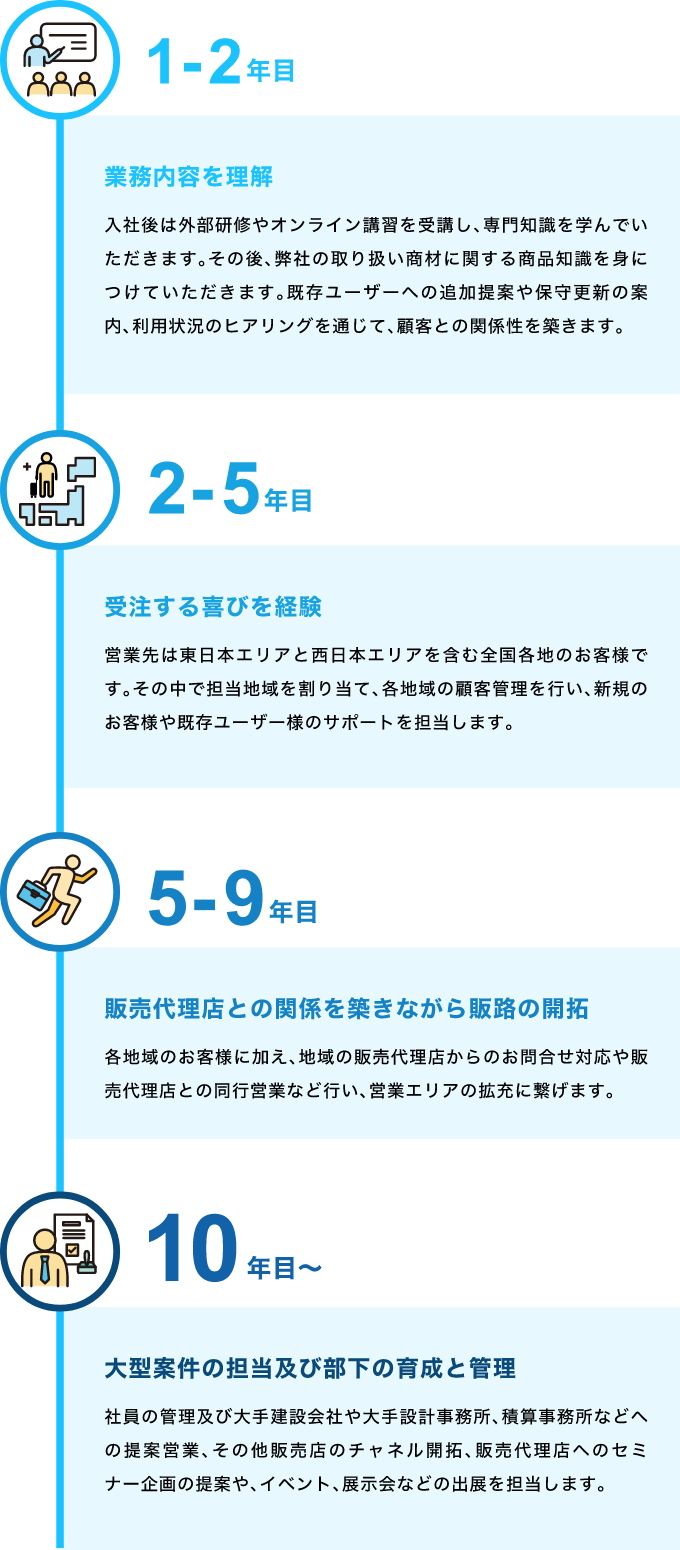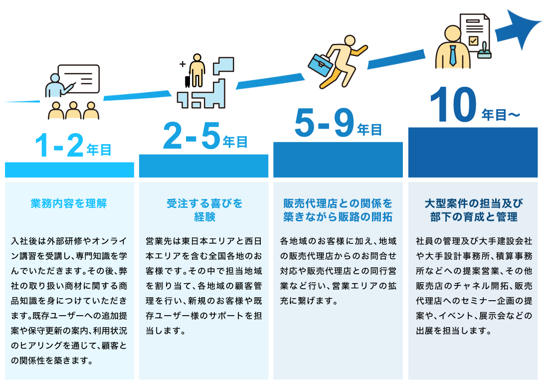 キャリアプランお客様は、建設会社や設計事務所、積算事務所への提案営業がメインとなるので、建築の専門用語が身に付きます。また、システム営業でもあるのでパソコン等のIT分野の知識も身に付きます。