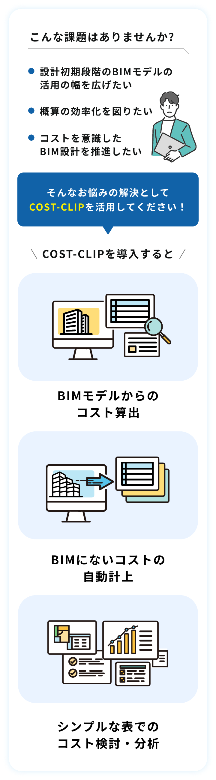 コストクリップ概要「COST-CLIP」は、設計担当者やコスト担当者向けのコストマネジメントシステムとして、設計初期段階から、シンプルな操作でリアルタイムに概算コストを把握できます。BIMモデルからのコスト算出だけではなく、BIMにない概算項目の自動計上にも対応しています。